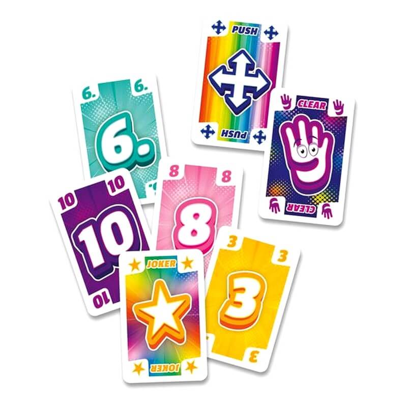 Un JOKER a n’importe quelle valeur et peut être joué seul ou avec d’autres cartes numériques. Pour jouer Clear, retirez cette carte — et la pile de défausse — du jeu, puis jouez à nouveau. Pour jouer Push, retirez cette carte du jeu, puis poussez la pile de défausse devant un autre joueur, qui doit ajouter toutes les cartes qu’elle contient à sa main ; votre tour est alors terminé.