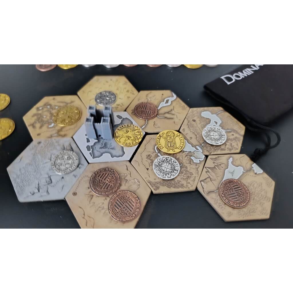 There are three factions that claim dominion over a given territory. Each faction is represented by a metal coin, which, when placed on a territory, indicates its assignment. The game is developed on a variable board, built from hexagons. During setup, each territory is assigned to a faction. Each player represents a Roman Consul, a Celtic chieftain, a medieval lord, an Inca general, an Ottoman noble, or the head of an English noble family. The objective of the game is ultimately to be on the side of the winning faction.