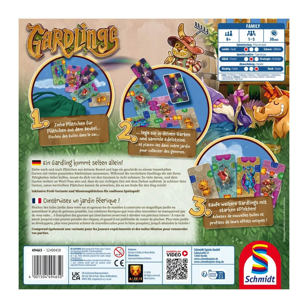 À chaque tour dans Gardlings, tous les joueurs construisent simultanément leur jardin devant eux. Vous pouvez arrêter de piocher des tuiles à tout moment, car si vous piochez trop de gnomes, ils vous voleront vos gemmes.
