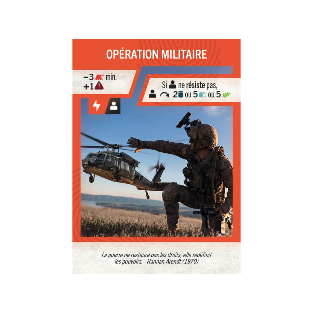 1) La phase Politique où vous prenez des décisions politiques. Piochez et jouez des cartes par paires en appliquant leurs effets : améliorer le niveau de vie de sa population, construire des usines, promouvoir le végétarisme, attaquer une Nation, avoir une production délocalisée, etc.