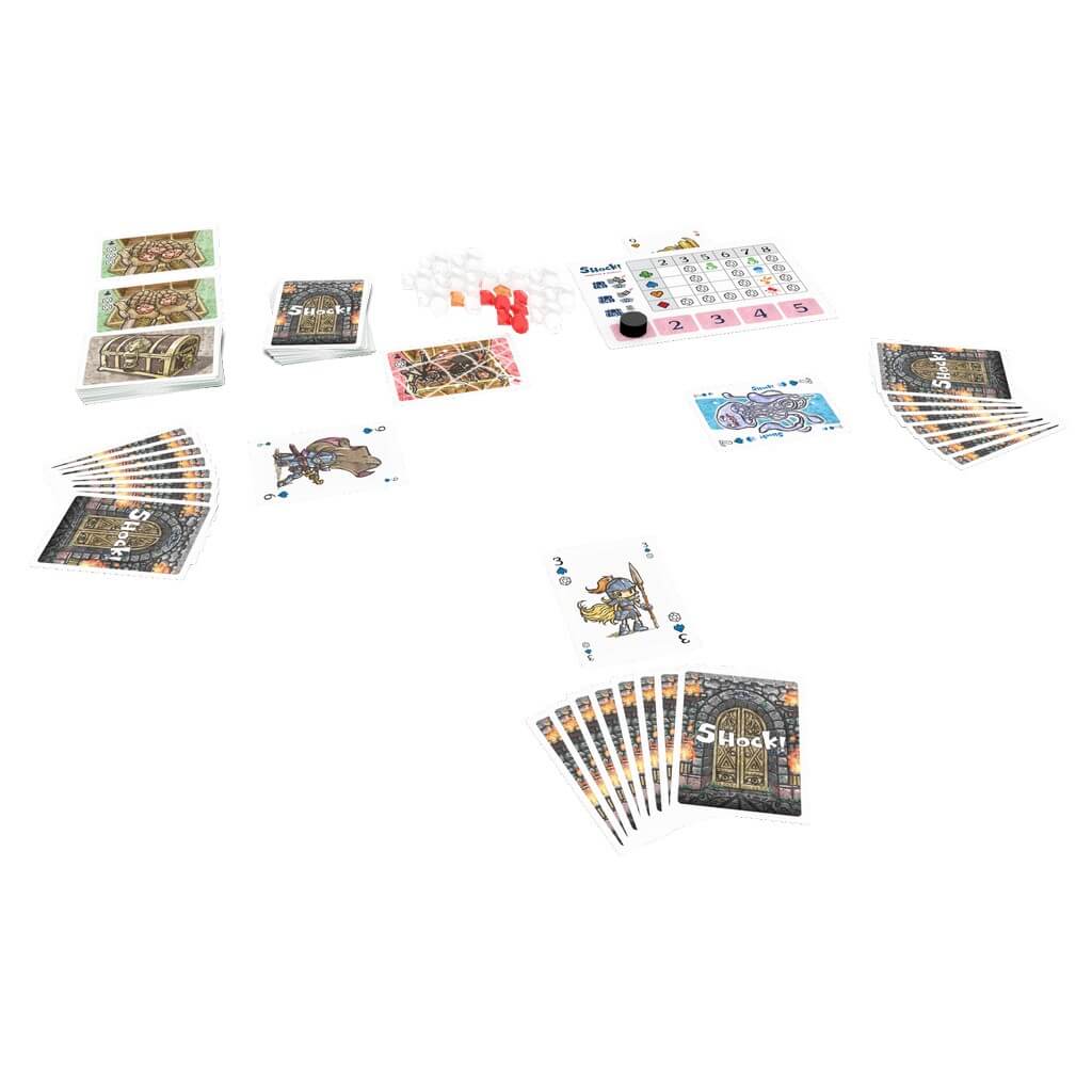 The cards consist of ranks 1 through 11 in four suits. The base game uses 3 types of poisons, and 4 optional cards add a fifth. Some cards have jewels, and some have medicine. Other cards have no special feature.